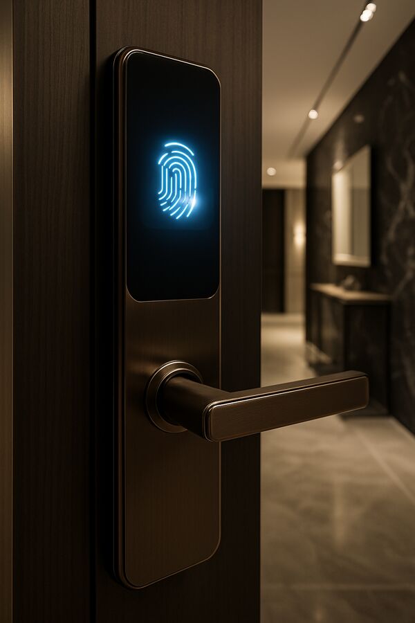 •Controle de Acesso Biométrico: Fechaduras inteligentes com reconhecimento facial ou digital, integradas a sistemas de intercomunicação que permitem o acesso remoto e o monitoramento de visitantes.